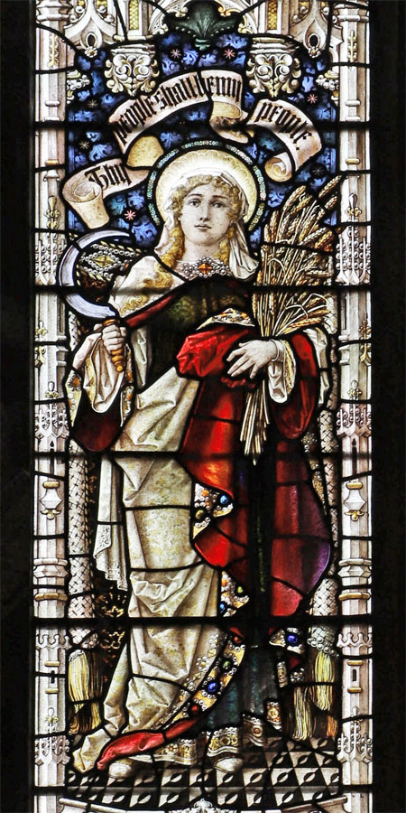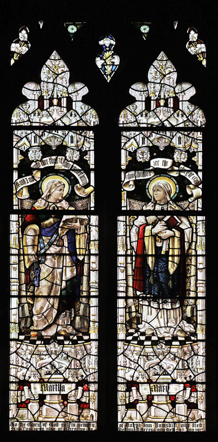 The two two-light windows in the north wall of the north chapel form a unified theme of standing female saints and Old Testament matriarchs. Judging by the similarities in style and execution of the windows, and although installed two years apart, it is likely that the designs for both were created at the same time. North chapel north 1 was installed in 19101 and depicts the Old Testament figures of Ruth and her mother-in-law Naomi, drawn from the Book of Ruth. North chapel north 2, installed in 1912 depicts the sisters Martha and Mary of Bethany and like the north chapel east window is drawn from a story only related in the gospel of Luke.The dedication inscription at the base of the window reads: