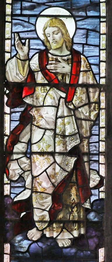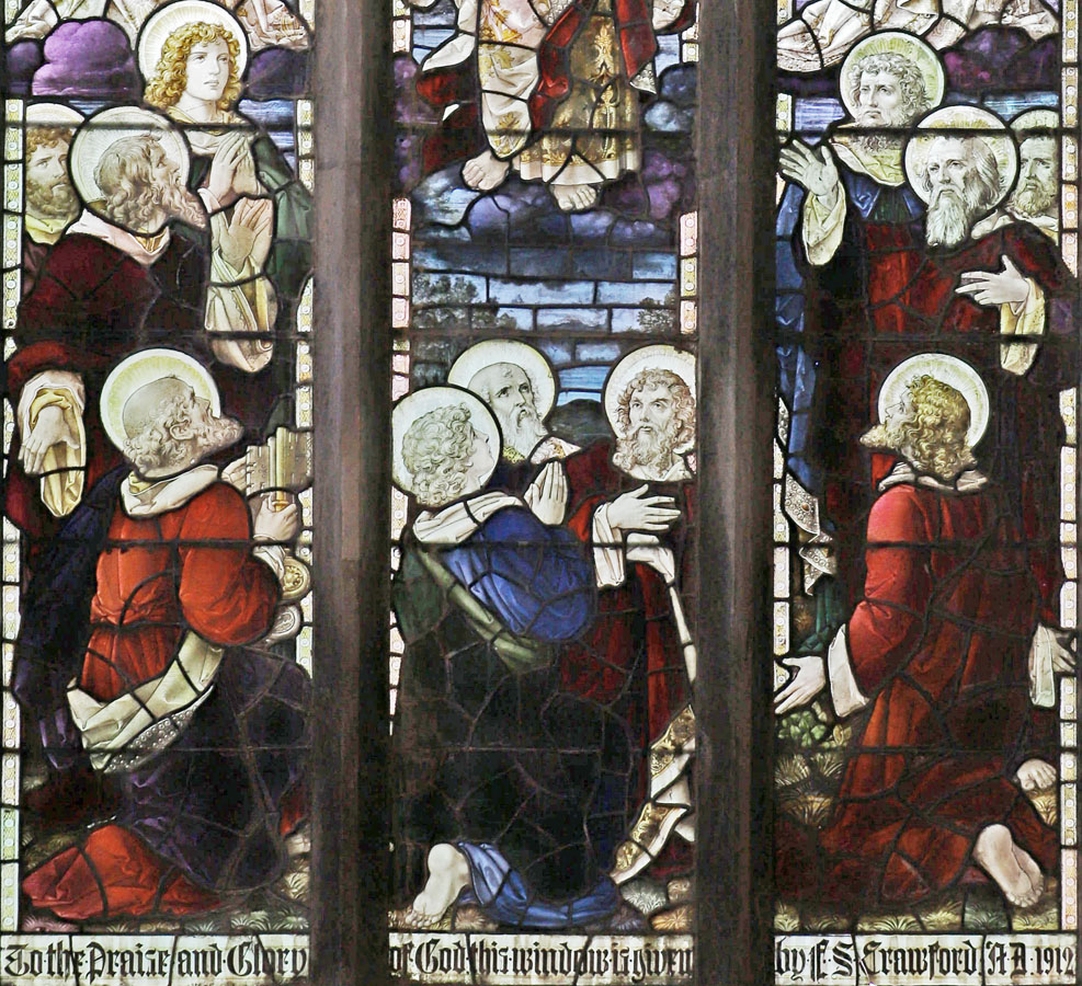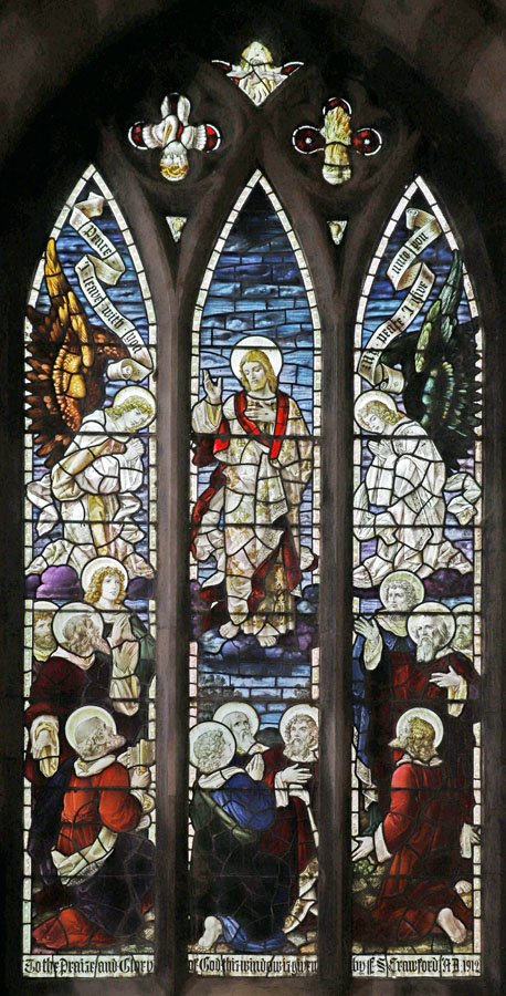 The window was installed in 1912 and depicts The Ascension of Christ as told in John 14:27: "Peace I leave with you; my peace I give you". The scene spreads across all three lights and, unusually for a Bacon Studios design, extends into the simple white borders of the three lancests which make up the window. In the tracery, a pelican in its piety, a white dove representing the Holy Spirit and a wheat sheaf. The significance or symbolism of the latter is not clear.