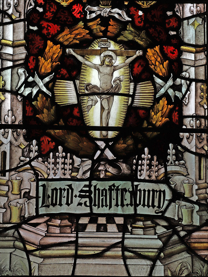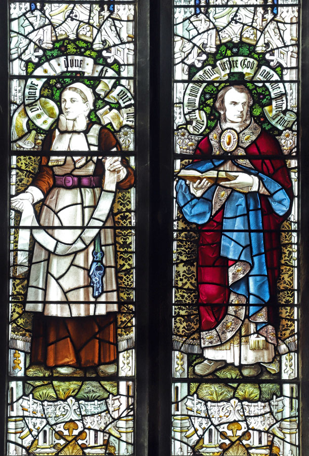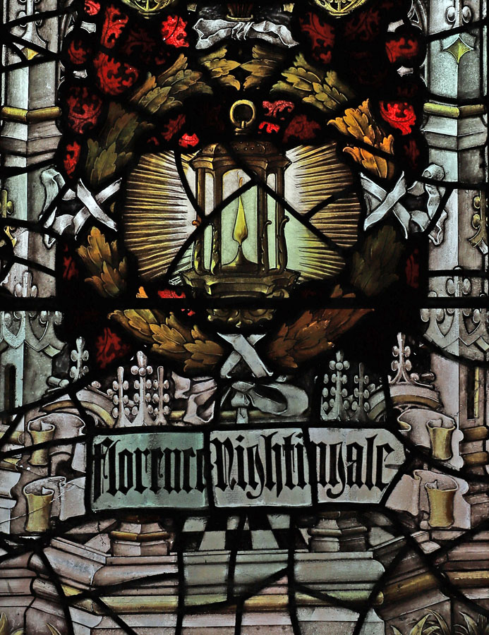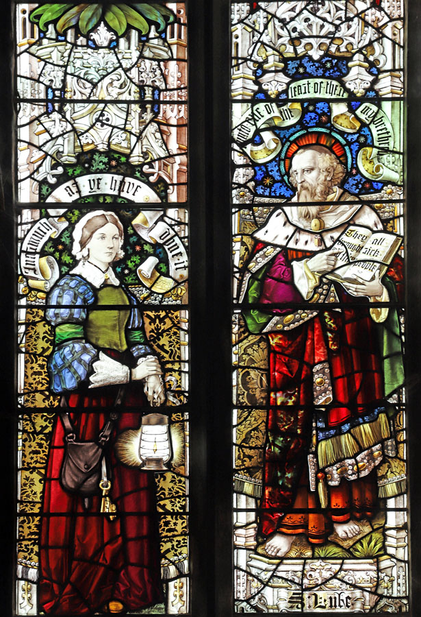 The window illustrates the virtues of Prudence, Temperance, Fortitude and Justice as typified by Florence Nightingale, Sister Dora, Charles Kingsley and Lord Shaftesbury, paying homage to acts of corporal mercy and self sacrifice for the good of others. Two saintly figures are also represented; St Luke and St James the Great, the patron saints of physicians, and pharmacists respectively. Luke holds an open book with the words, "They brought unto Him all sick people" (Luke 4:40). Above him his symbol of the Ox. James is depicted as pilgrim, holding a pilgrim's staff with gourd, and his symbol of a scallop shell above him.