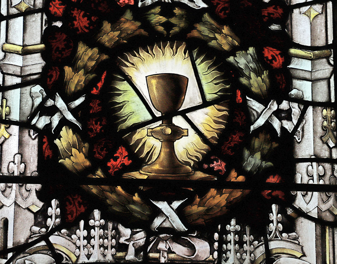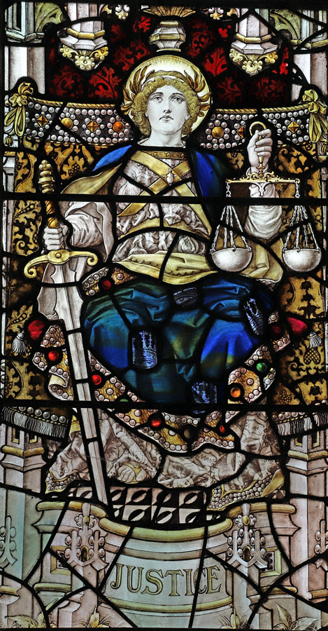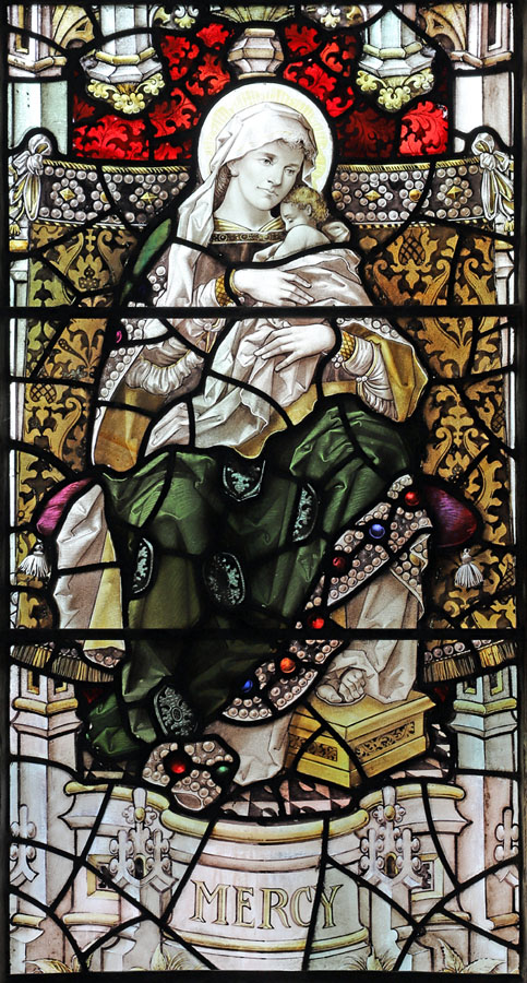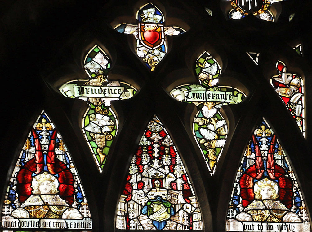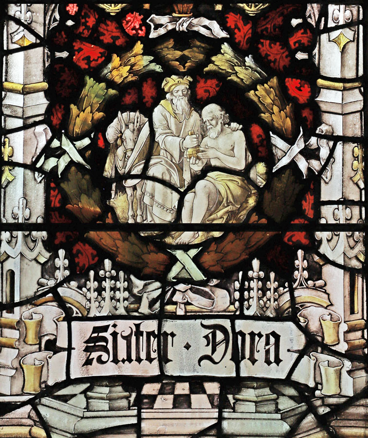 The scrolls above the figures bear texts drawn from Matthew 25:40 and James 1:27; "Inasmuch as ye have done it unto one of the least of these my brethren, ye have done it to me", and "Pure religion undefiled before God and the father is this; to visit the fatherless and widows in their afflictions and to keep oneself unspotted from the world". Demi-angels with scarlet wings above each of the four likenesses hold a scroll with words from Michah 6:8; "what doth the Lord require of thee but to do justly and to love mercy, and to walk humbly with thy God". In the tracery, set amongst vines and announcing the theme of the window; "Prudence", "Temperance", "Fortitude", and "Justice". In the upper tracery, on the far left a flaming heart and right the scales of justice, and at the very head two (as yet unidentified) coats of arms. In the predella beneath the figures, set within wreaths; (left to right). a lantern to represent Florence Nightingale bring light to the afflicted, a seated woman holding a child representing the virtue of Mercy, a scene from the parable of the Good Samaritan to illustrate compassion and the institution (Christ Church sisterhood - AKA "The Good Samaritans") which Sister Dora joined in 18642, a golden chalice, the seated figure of Justice, and Our Lord on the cross representing the supreme sacrifice.
