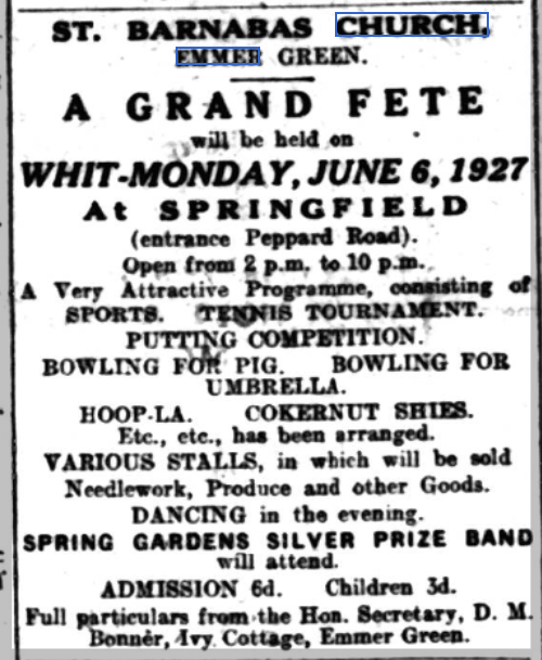 fund-raising events such as fetes, and contributions from the growing congregation of the area. In the first phase of the building only the nave was completed, but even then there was an outstanding debt of £800.3 The chancel would have to wait. From 1925 annual fund raising fetes were organised, and Percy and Clara Bacon would often host the events at their home "Springfield" Contemporary photo of Springfield, Surley Row, Caversham, where Percy and Clara lived until his death in 1935. in Surly Row, Caversham, where they had a meadow of sufficient size. This probably lay to the south or north east of their house as a map of the area from 1935 might suggest. These areas are now occupied by new housing developments and a care home. The fund raising efforts of the congregation enabled the outstanding debt to be settled by 19274 and sufficient funds were raised by 1929 to complete the chancel. The church was consecrated in that year on the festival of St Peter (29th June).