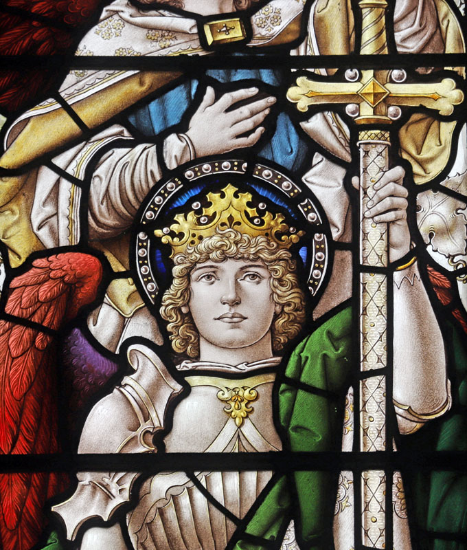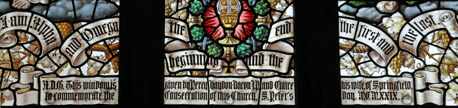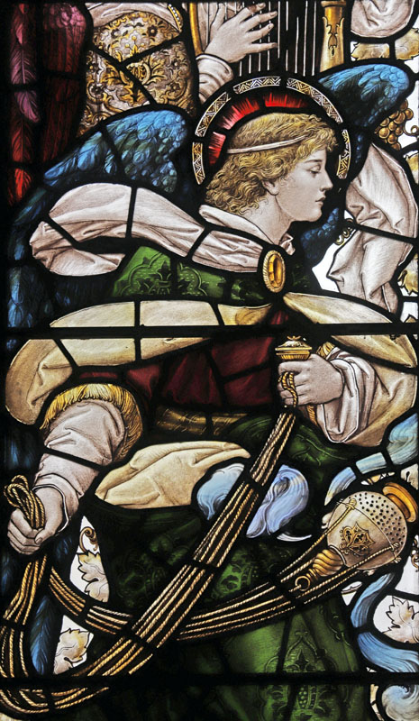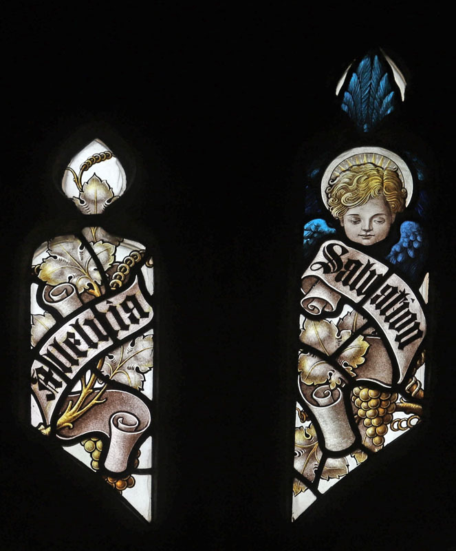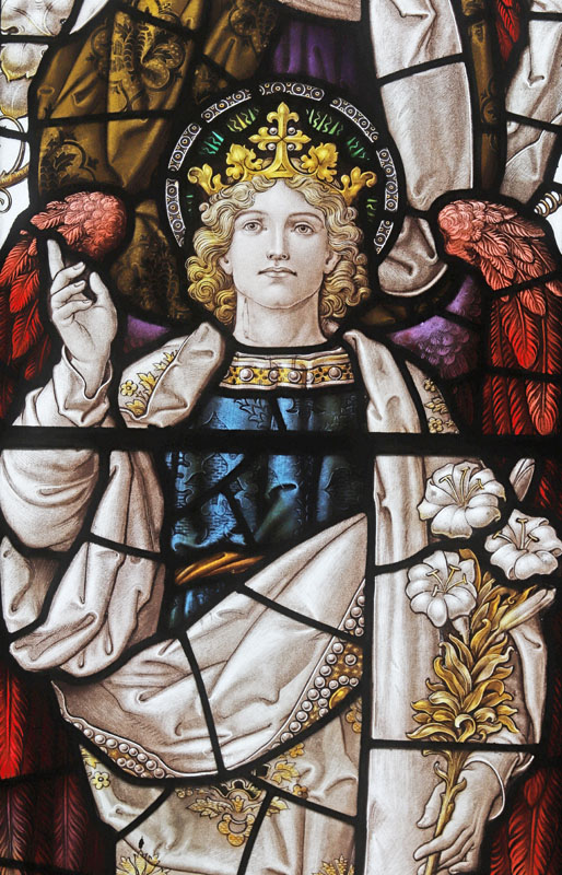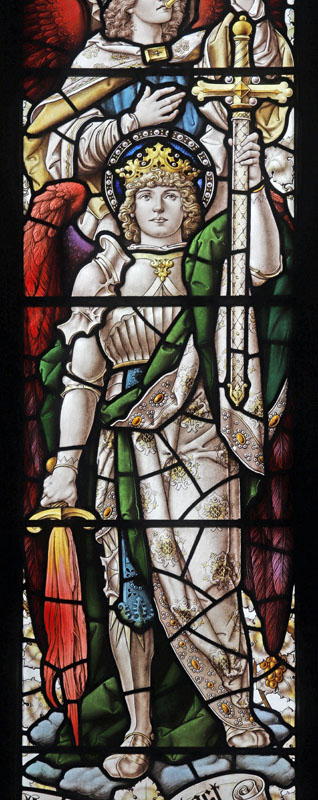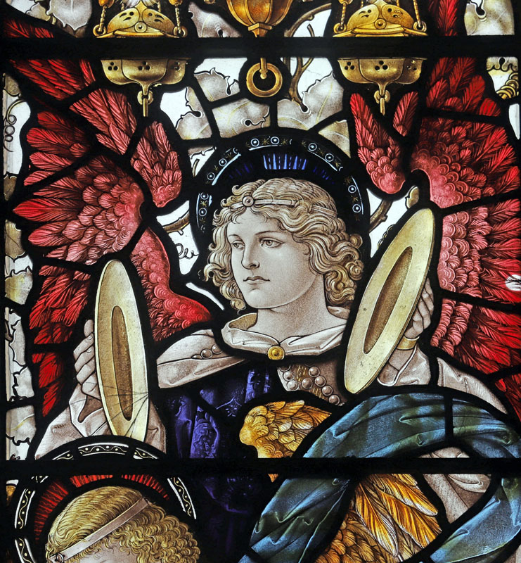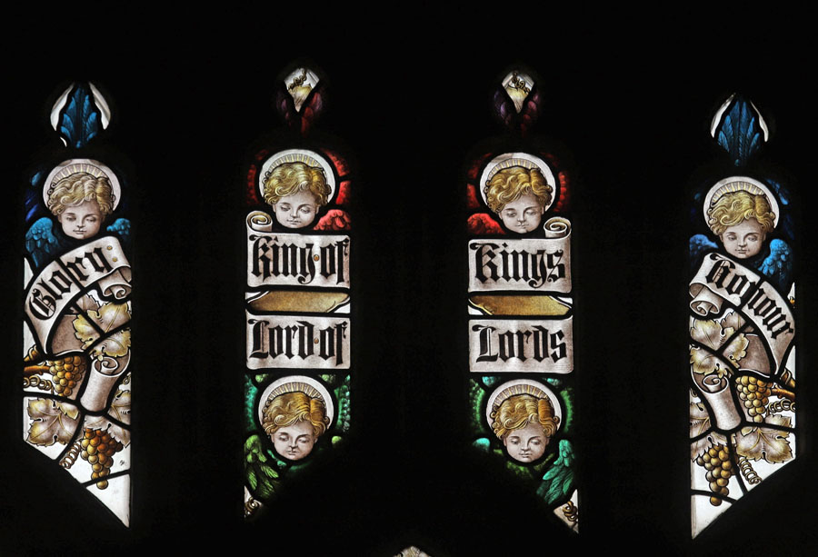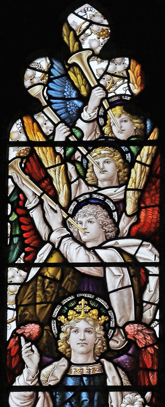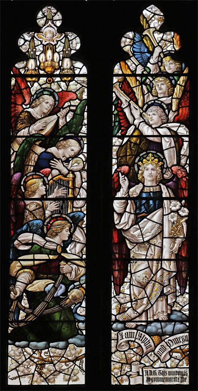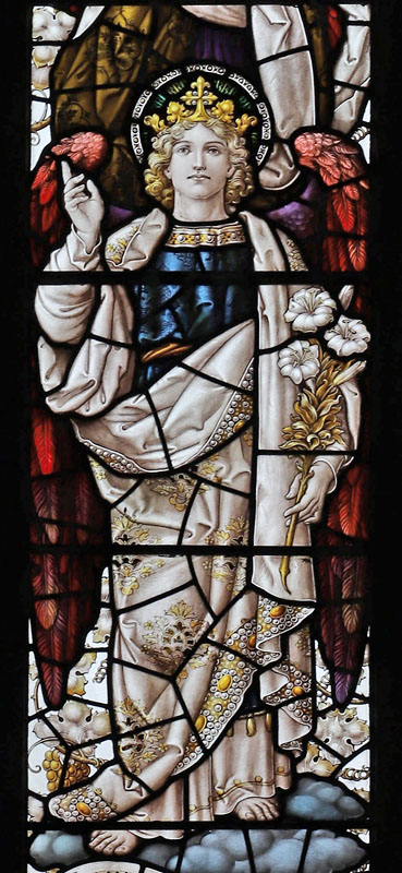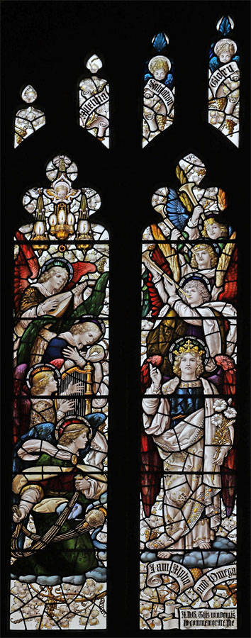 The east window is a later work of Percy Bacon and perhaps one of his best. It was gifted by Percy and Clara, and installed in time for the full opening of the church.5 The subject is Christ the King flanked by the figures of Archangels Gabriel and Michael, and surrounded by an angelic host playing instruments. Many of the cartoons used were borrowed from the 1921 Te Deum east window at All Saints, Bournemouth, or the 1924 east window at Canewdon, Essex. In the tracery angels hold scrolls with the words: "Alleluia", "Salvation", "Glory", "King of Kings", "Lord of Lords", "Honour and Power". At the base of the window on a scroll quoting from Revelation: "I am the Alpha and Omega, the beginning and the end, the first and the last". The inscription reads: