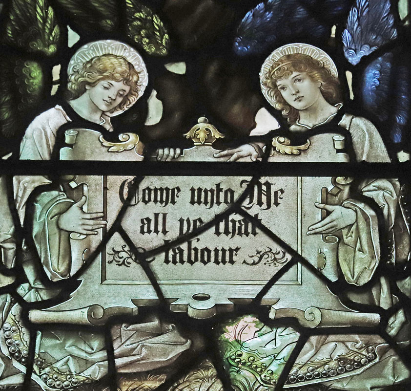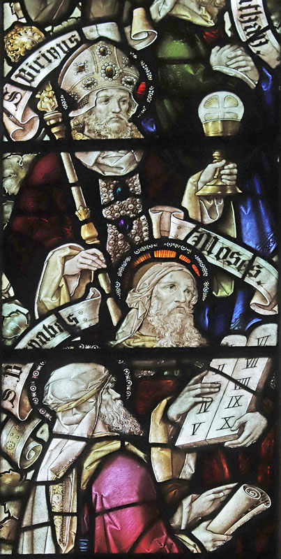 The west window would have been installed during the first phase of construction of the church when funds only extended to building the nave. The window is a Te Deum. As with the later east window this window is crammed with interest. Many saints and prophets are represented as follows: