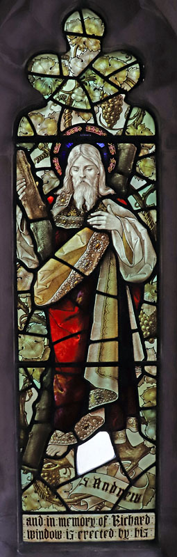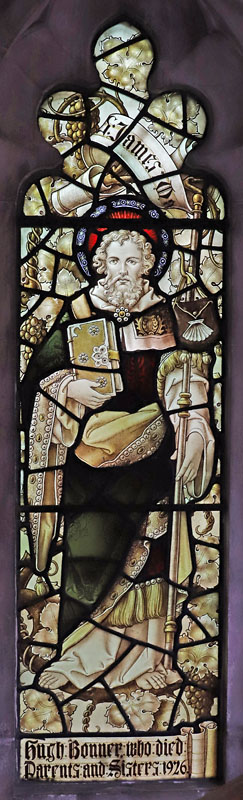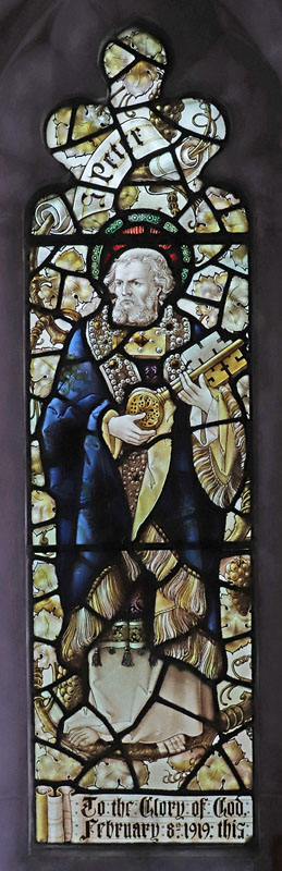 In the small side chapel or baptistery at the south west end of the nave is a small three light window depicting three disciples: St Peter, St Andrew, and St James the Great, all with their symbols. This window was installed coeval or very soon after the initial phase of construction.