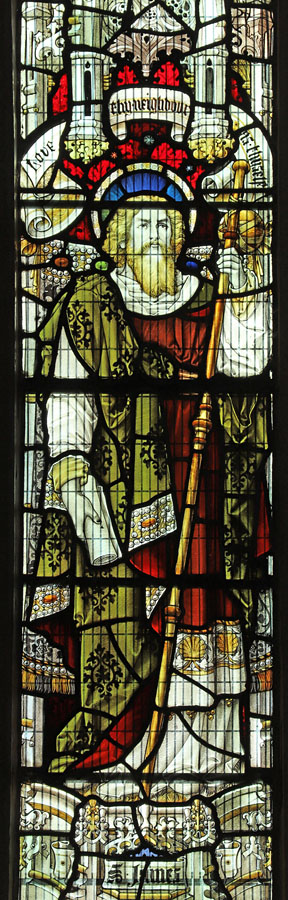 There is a single window by Percy Bacon and Brothers in St Mary's. The two light window depicts the standing figures of St. Luke and St. Elizabeth, each figure occupying an elaborate niche without side columns. Luke holds a pilgrim's staff and gourd in his left hand, and a scroll in his right. The scroll above reads, "Love thy Neighbour". Elizabeth is dressed in an extravagant blue robe lined in red and edged with gemstones. The scroll above her reads, "Blessed art though among women".
