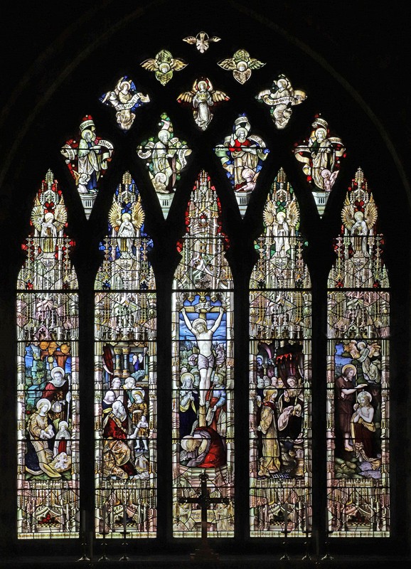 The main lights cover scenes from the life of Christ, each in its own niche with wide columns and a pedestal below, conforming to Percy Bacons "manifesto". The central light is the Crucifixion with Mary and John, a Roman Soldier, and Mary Magdalene at the foot of the cross. The other lights (L-R) are; Nativity, Christ with the elders in the temple, Christ before Pontius Pilate, and Baptism of Christ.