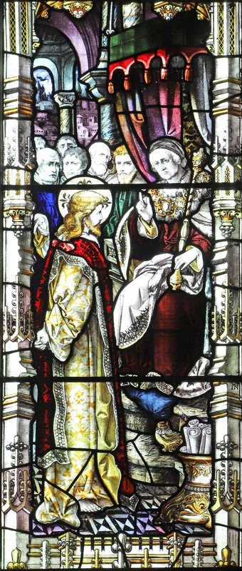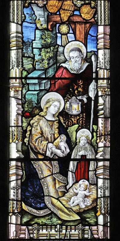The east window is one of the earliest works of the Percy Bacon studios, and this window is one of only 11 commissions confirmed to have been completed in 1893. It is illustrative of the high standards which the firm had adopted right from the start. The detail is astonishing; The architectonic devices are more elaborate and effusive than ever, all but the central light canopies are topped by guardian angels, witnesses to the proceedings below them. In the lower tracery are the four evangelists with their emblems and higher still more angels holding scrolls which read, "Wonderful" & "Counsellor". At the very top a white dove.