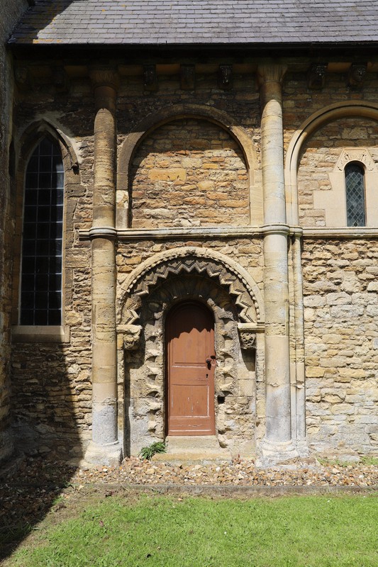 St James is a fine, elegant church, its tall slender tower with crocketed spirelets and a graceful spire with pierced flying buttresses is the tallest in the county. The tower is some 20ft lower than the original which collapse after a lightning strike in 1804.1 It is said that on a good day the hills of Worcestershire are visible from the tower. The chancel is 12th century with a fine archway from the nave and an external blind arcade on the south side with demi-columns in two stages up to the corbel table which has carved heads. In places the arcade is pierced by narrow round-headed windows with deep internal splays and to the west a fine priests door with dog-tooth carved semi-circular head, the door itself with a plain arch concentric with the hood and elaborate and unusual scalloped carvings on the door shafts. The chancel was restored by G E Street in 1865, and although a great deal of it was taken down and rebuilt, thankfully he preserved the south wall, and restored the high Norman windows. Prior to Street's restoration the church was clearly in considerable need of attention, as is attested by this drawing which appeared in the Builder of March 1847.2 The inverted V moulding above the door was removed but the horizontal string course preserved. He also (as the Builder put it) "discovered" three sedilia which were preserved.3 These were actually known about a full six years prior to Street's intervention as is attested by a correspondent to The Builder in May 1859, signing themselves as "AMANUENSIS", who wrote: