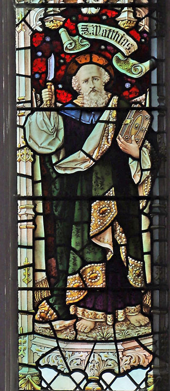 Installed in 1925 from the studio of Percy Bacon Limited, the aperture for this window is identical to that of SA3 and Bacon has used the same design, with some minor variations and colour scheme. The niches are not as elaborate, and the colouring is green rather than yellow. The central figures of Simon & Jude crowd the single pedestal which like SA3 extends to the base of the window. It is clear that the window has been modified over the years to include an additional dedication, the most recent an inscription beneath St Matthias which reads, "In memory of Richard T Robins who read the lessons in this Church for 55 years. Died Dec 8th 1933 aged 87". This replaces the original inscription reported in the local press5 at the dedication of the window which read, "He was numbered with the eleven Apostles". The window was originally dedicated to Henry Wilson Robinson, Vicar of St Andrews for 35 years. The Rev. Robinson had expressed a wish to memorialise the local head teacher, and his name appears on the inscription in the left light.