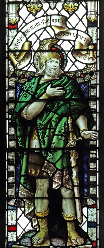 Installed in 1917 the window is dedicated to 2nd Lt Francis William Alexander Faithfull of the 2nd Seaforth Highlanders, killed in action at Ypres 3rd July 1915. The window depicts three warriors; Joshua, "Art thou for us or for our adversaries?”; an un-named soldier in armour (possibly representing Courage) holding a sword and shield, ”Nay as captain of the Lord’s host am I now come”, and David as a young man holding a sling-shot, ”I am come in the name of the Lord of Hosts”. The texts are from Joshua 5:13-14.