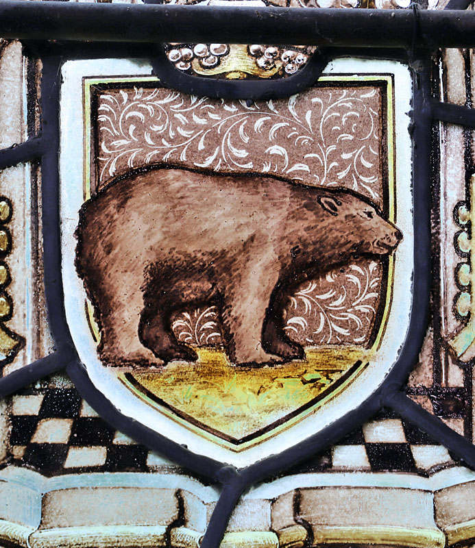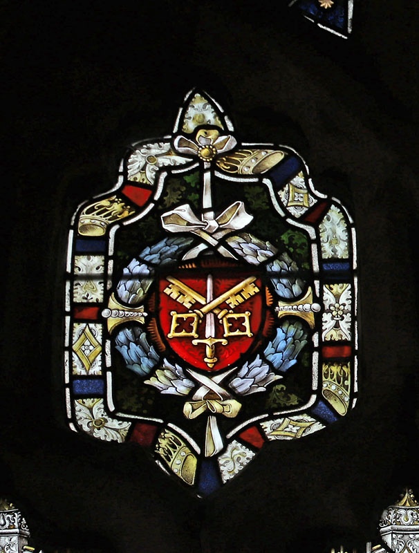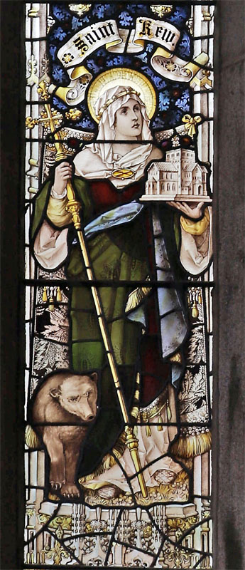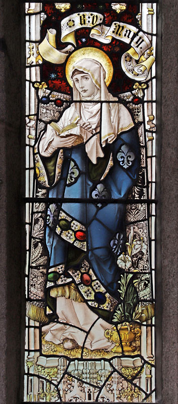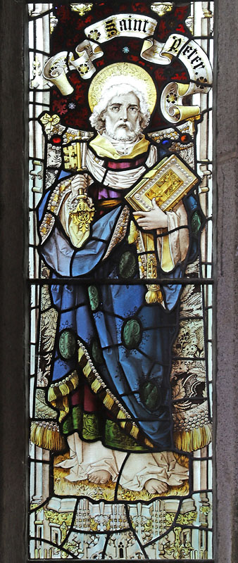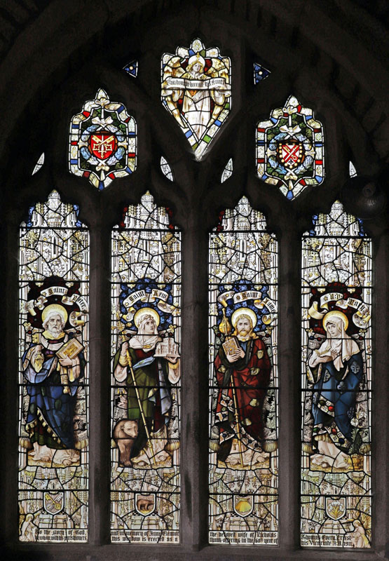 A four light window depicting St Peter, St Kew, St James and BVM installed in 19111. In the tracery arms of the Diocese of Exeter and Truo and an angel holding a scroll which reads; "This honour have all His Saints" (Psalms 149:9) . Each saint holds his symbols: Peter; Keys and a bible. Kew; a crossed staff and model of a church. St James; wearing a cloak embellished with scallop shells he holds a staff with pilgrim's gourd and a bible. The BVM holds a book with lilies beside her. At St Kew's feet, the apocryphal tamed bear. On shields below each saint their symbols are reinforced.