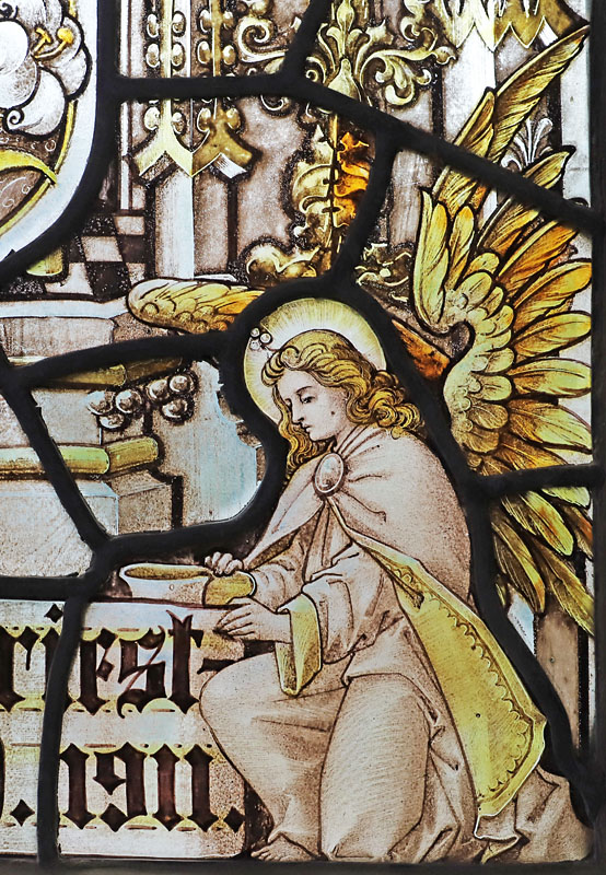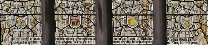The dedication on a scroll running across the four lights held by kneeling angels (a common Bacon motif) reads: To the glory of God and in memory of the beloved wife of Nicholas Thomas Every, Priest, by whom, with his parishoners this window is erected as a thank-offering in the 60th year of his Vicariate. A.D. 1911". The Rev Every who was considered to be "one of the best parish clergymen in the diocese of Truro"2; continued to serve his parish for another three years before his death in 1915.