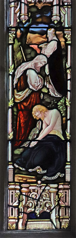 The window in the south wall of the south chapel of three lights with simple tracery depicts Christ Blessing Children, and although with some variation, it is clearly drawn from a similar design used for windows in Mickleham (Surrey - 1894), Repton (Derbys - 1904) and Haverhill (Suffolk - 1900).