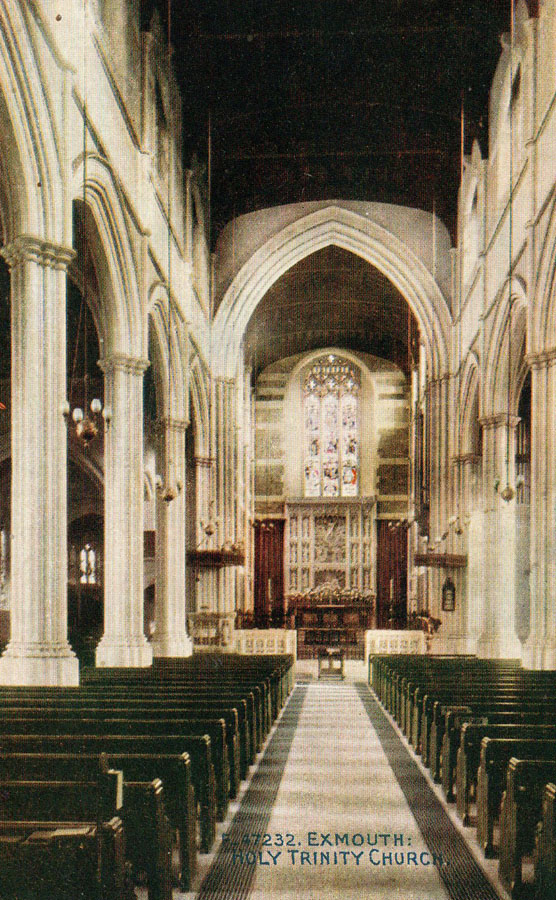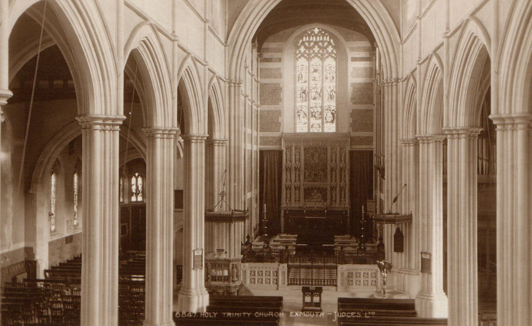 Holy Trinity, Exmouth is a fine example of Devon Churches. It stands proudly on the high ground of the town within its own close in an area known as "The Beacon". The original church was built by John Rolle, the 1st Baron Rolle between 1824 and 1833. This was described by the Building and Engineering News in May of 1916 as, "a sample of the worst type of so-called Gothic churches built about 1830", and consisted of a brick and stucco building, with columns constructed partly in stone and partly in cast-iron, cement-moulded arches, with clerestory above, and a flat lath-and-plaster, imitation-groined roof (read the full quote here).1 By the turn of the century the church had fallen into disrepair and was poorly maintained. Between 1905 and 1907 Mark Rolle, a nephew of the 1st Baron Rolle commissioned George Fellowes-Prynne to completely remodel and enlarge the church. Rolle had previously in 1893, commissioned Fellowes-Prynne to design a new church at Budleigh Salterton. The plans for Holy Trinity, Exmouth involved the replacement of the window mouldings with Bath stone, renewal of the window traceries, the addition of a Lady Chapel to the north transept, and a new organ. The aisle galleries were removed, the chancel extended and a west gallery installed. The latter has recently been removed and a whole suite of rooms installed at a first floor level, encased in large glass walls; a necessary modernistic re-purposing perhaps, but nonetheless the whole result is (at least to this author's eye) a little insensitive. Mark Rolle died in 1907 as the renovation work was near completion, and his benevolence is commemorated by a brass plaque in the lady (or Rolle) Chapel. Click here for early images of the remodelled church.