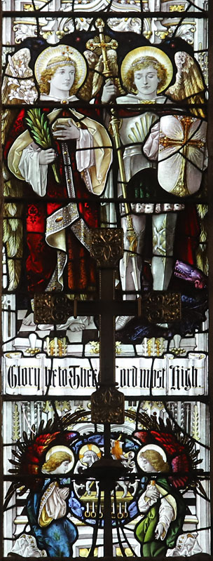 In the tracery three angels hold scrolls which read: (l-r), Sanctus Pater, Sanctus Filius, Sanctus Spiritus, with angels in the smaller lights playing musical instruments. At the very top an IHS monogram.