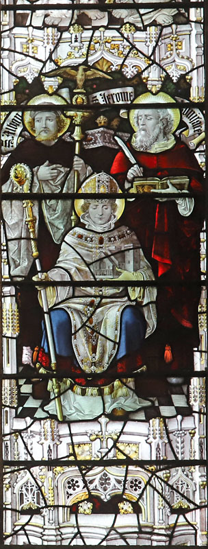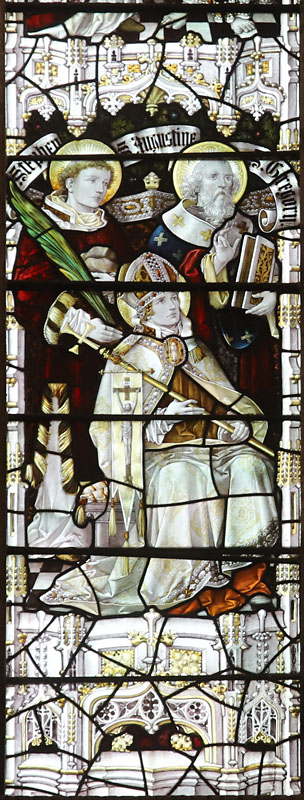 Left: St Stephen, first Christian martyr, the seated figure of St Augustine as Archbishop of Canterbury, and St Gregory.