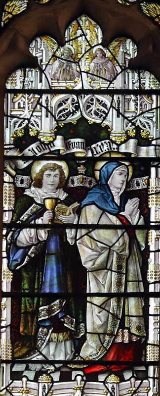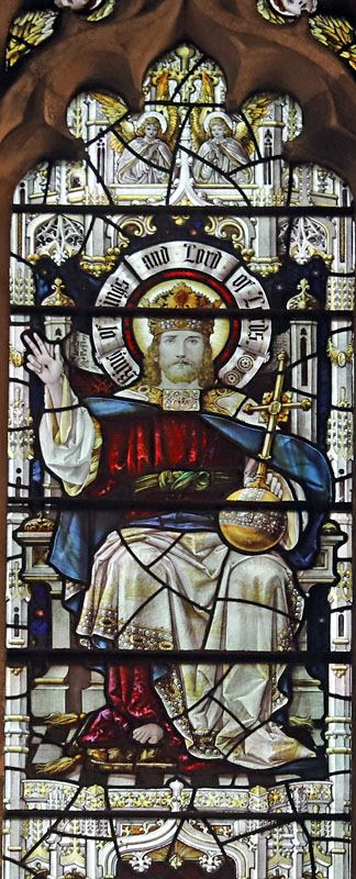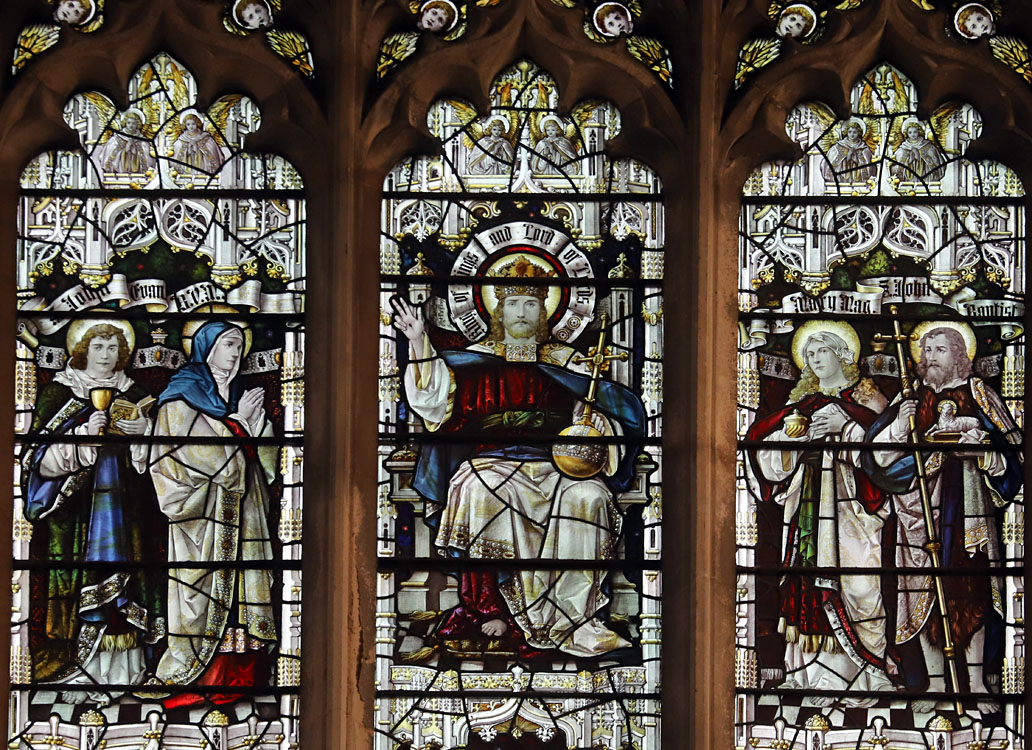 The east window is part of the original glazing scheme commissioned by the architect George Fellowes-Prynne. The theme of the window is "The Church Triumphant". Top centre is Christ in Majesty, the scroll around his halo inscribed, "King of Kings, Lord of Lords". In the upper left light, St John the Evangelist and the Blessed Virgin, and in the upper right, St Mary Magdalene and St John the Baptist.
