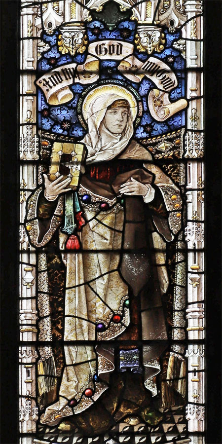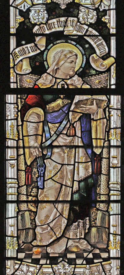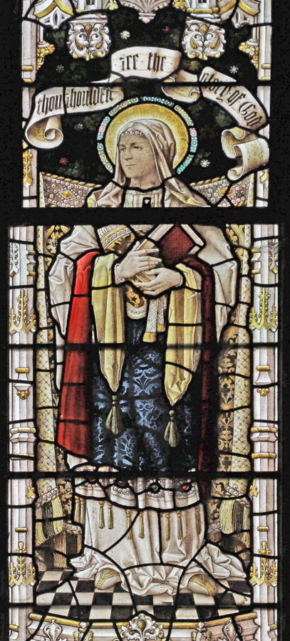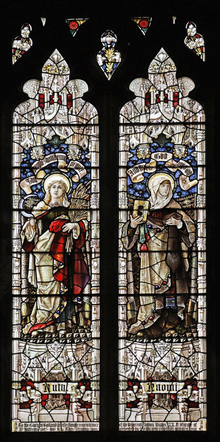 The two two-light windows in the north wall of the north chapel form a unified theme of standing female saints and Old Testament matriarchs. Judging by the similarities in style and execution of the windows, and although installed two years apart, it is likely that the designs for both were created at the same time. North chapel north 1 was installed in 19101 and depicts the Old Testament figures of Ruth and her mother-in-law Naomi, drawn from the Book of Ruth. North chapel north 2, installed in 1912 depicts the sisters Martha and Mary of Bethany and like the north chapel east window is drawn from a story only related in the gospel of Luke.The dedication inscription at the base of the window reads: