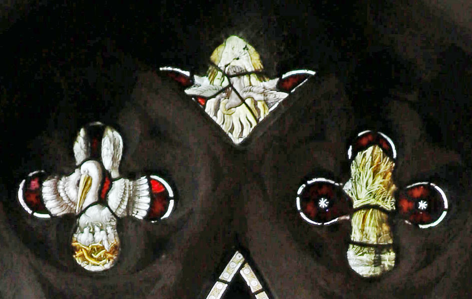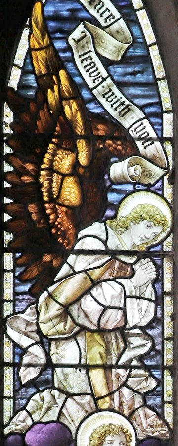 The window was installed in 1912 and depicts The Ascension of Christ as told in John 14:27: "Peace I leave with you; my peace I give you". The scene spreads across all three lights and, unusually for a Bacon Studios design, extends into the simple white borders of the three lancests which make up the window. In the tracery, a pelican in its piety, a white dove representing the Holy Spirit and a wheat sheaf. The significance or symbolism of the latter is not clear.