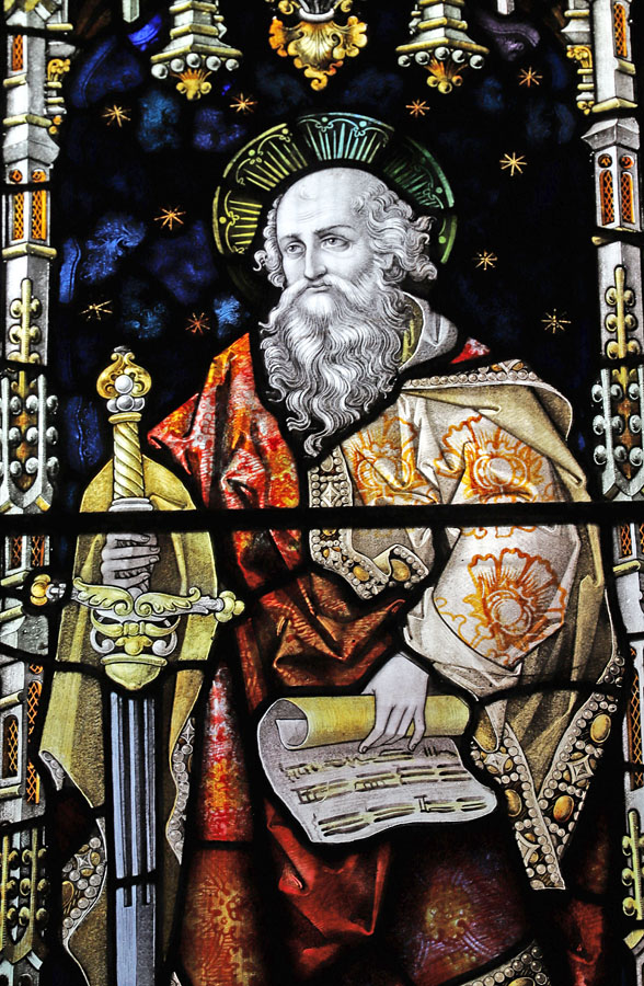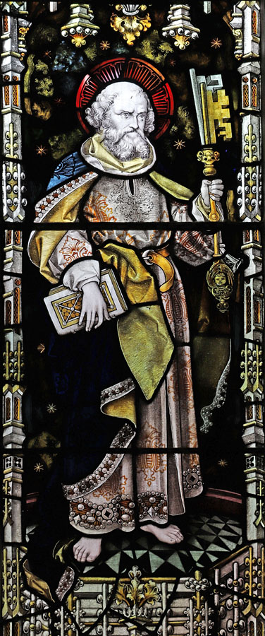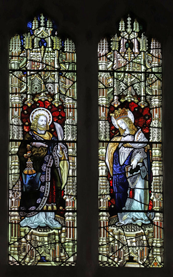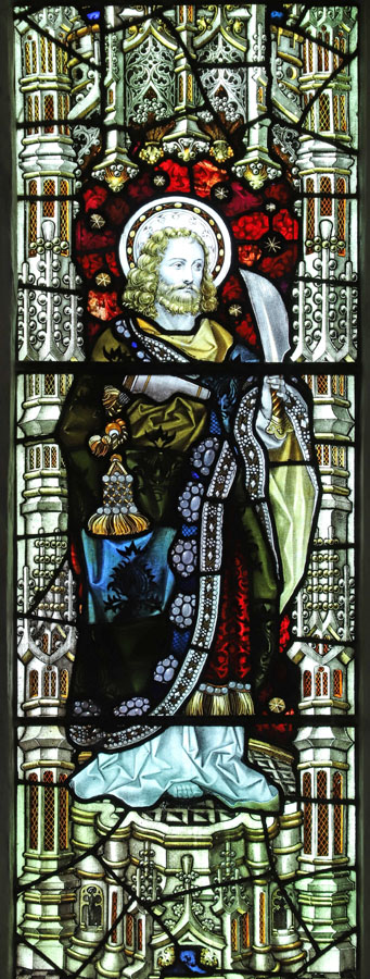 There are two windows from the Bacon Studios at Cranborne. These windows were installed around 1895, and record the transition from the use of the "Three Bees" to the Bacon Coat of Arm rebuses. Clearly the three busy bees rebus which was first used by the studio, refers to Percy and his two brothers, Herbert and Archibald. The question arises as to why at this time, and relatively early in the firm's development, there was a need to change it. The obvious (though speculative) reason would be that one of the three brothers left the company, i.e. Herbert. The adoption of the Bacon arms was also short-lived. One of the first uses was in the south transept window in St Peter's, Bournemouth from 1896. However, after 1898 there are no examples of the shield being used. Windows after that time, when signed, were furnished with a written credit. It may be possible that Bacon had used the arms without being entitled under the College of Arms Rules (coats of arms are awarded to individuals, not families), or perhaps there was an objection from the true owner.