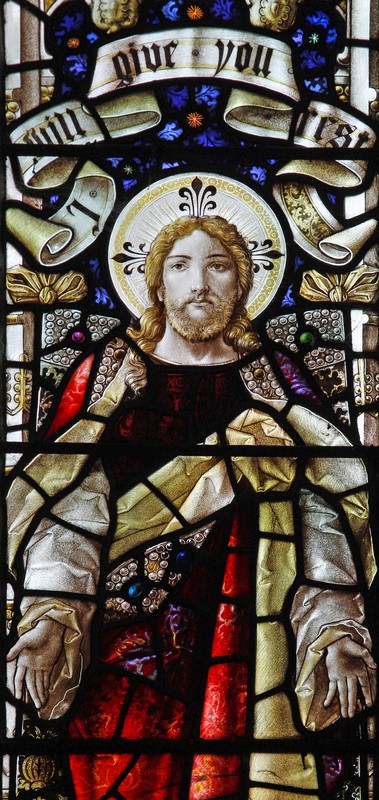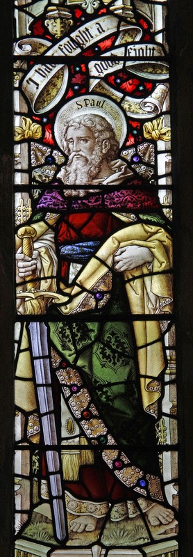 Pilsdon has a single stained window of 1918, the east. Like many of Bacon's windows during and after the first world war, this is a memorial to a fallen soldier, Arthur Leslie Jenks who died of wounds in Palestine on 7th October of that year, and repeats many of the figures and themes common to such memorials. The window is of five lights. Christ the Consoler is flanked on the left by St Ann and Courage, and on the right by St Paul and Victory. The image of Christ is from the same cartoon as that in Marwood, St Michael & All Angels, Devon, and those of Courage and Victory are often repeated in other Bacon memorial windows (see Dunchurch, Warks, and Sandy. Beds, amongst others). St Ann holds a book with the words from Proverbs 31:28. The tracery contains various Arma Christi, and a plethora of "filler" cherubs, their heads cupped in their wings, a somewhat over- used Bacon motif, though one in this case which would have relieved the designer of having to over-think the subject matter and come up with multiple designs for those fiddly little openings which most people would probably ignore anyway. It may also have been a cost cutting measure as these repetitive images were likely to have been mass-produced by junior staff at the firm. Another well used device is also apparent in the east window. Each figure stands in front of a bejewelled drape, or curtain, hung by golden ribbons tied to the niche columns.