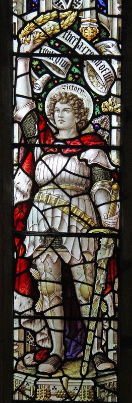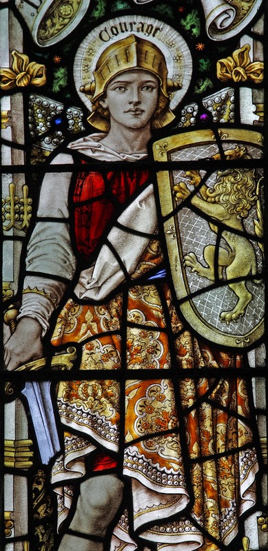It is sometimes difficult to get very close to windows to view their complexity (especially east windows) given their height, or the barriers such as reredos or altar tables which often partially obscure or physically impede the viewer's proximity. But only when one gets very close to the windows can the astonishing details which have been created be seen. However, powerful lenses and high resolution computer screens can help in discerning the detail and enable an appreciation of the work which has gone into the painting of this window, such as the astonishing floral patterns on Courage's cloak, or the fine brush strokes used to pick out individual strands of hair.
