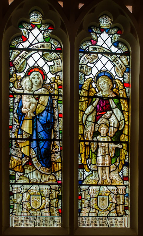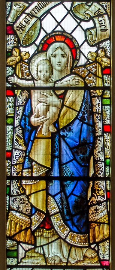 The single two-light window by Percy Bacon depicts, in the left light, the Blessed Virgin Mary and child (an often used Bacon motif, the infant Jesus with outstretched arms), and in the right, a Guardian Angel with a child. Above the figures are scrolls: