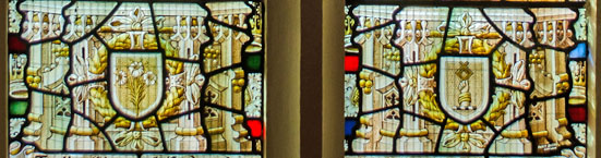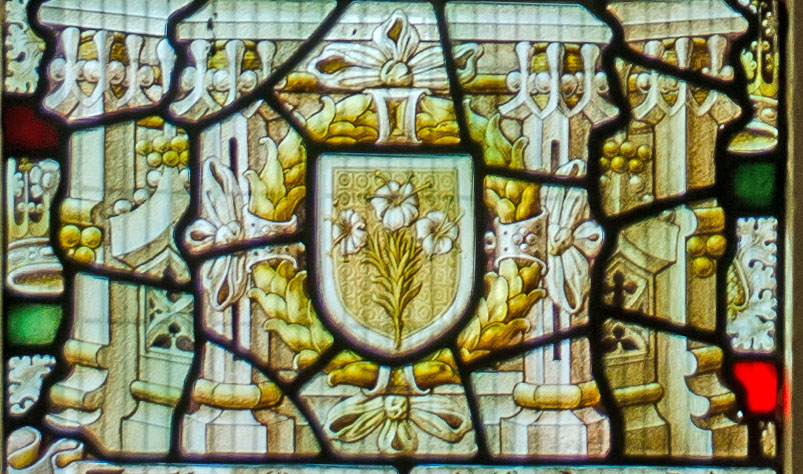 In the predella: left; a shield emplazoned with lilys, and right; a shield with a hand holding what appears to be some form of set square.