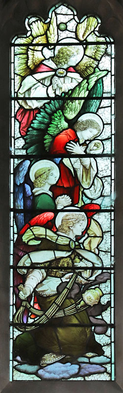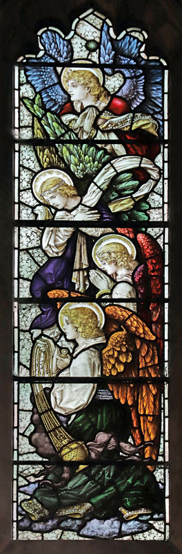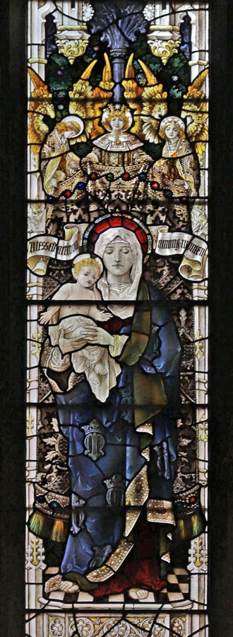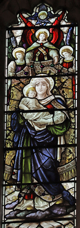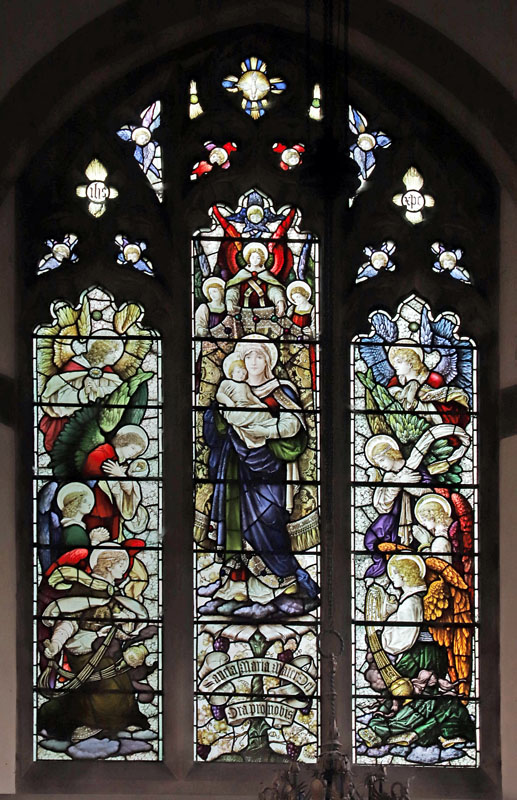 The window is of three lights with tracery, the central light depicting the Madonna and child, and the outer lights groups of adoring angels, the two lower one swinging censers on long chains. Above and behind the mother, three angels hold the drape behind her, and beneath her a scroll which reads, "Sancta Maria, Mater Dei, Ora pro nobis". A similar cartoon of the mother and child with attendant angels was used for the central light of the north chapel east window in St Andrew's Boscombe, Dorset. The window is not very large, so the usual wide columns and elaborate niches have been omitted. In the tracery, a white dove symbolises the holy spirit descending, with the smaller lights hosting cherubs and IHC and XPC monograms.