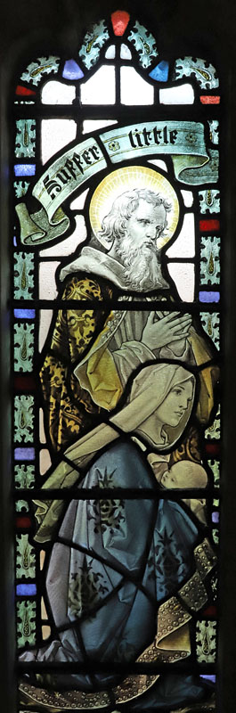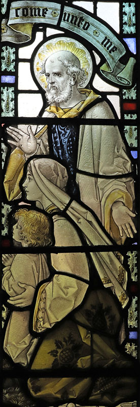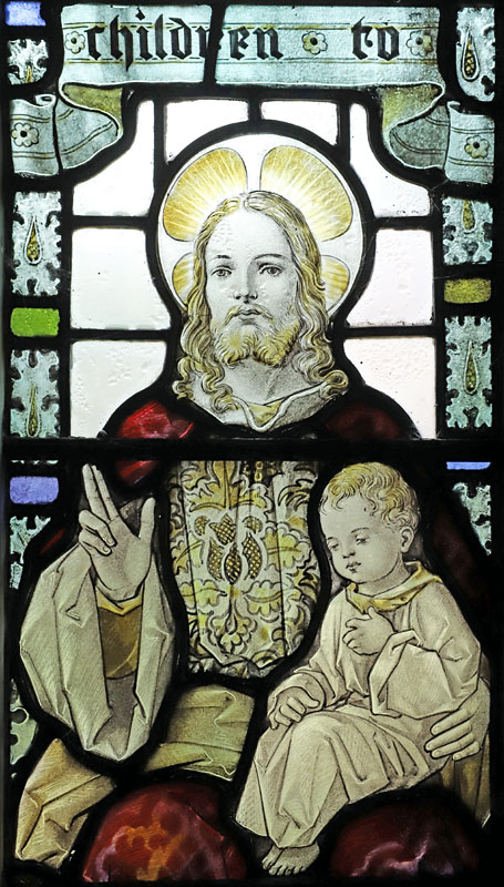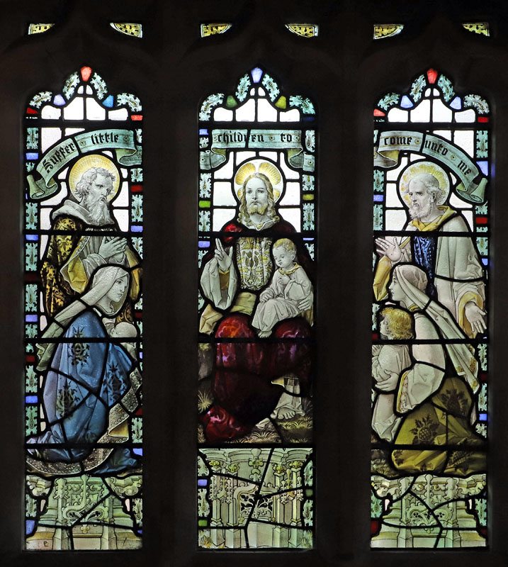 The window depicts Matthew 19: 13-14: a seated Christ blessing children, one child sitting on his knee, and two chaperoned by their mothers, while two of his disciples look on. On a scroll crossing all three lights; "Suffer little children to come unto me". The window is dedicated to Martin Maffey († 1909).