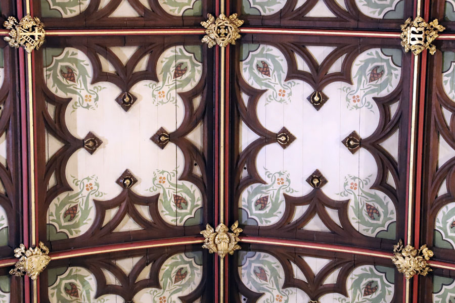 The 1893 works also included the painting of the chancel ceiling above the sanctuary, and the east wall, the latter having three angels either side of the arch of the east window and on both sides, two Latin Doctors of the Church; to the left, St Ambrose and St Gregory, and to the right, St Jerome and St Augustine. The total cost of the decorative works was between £150 and £160, with monies raised by the congregation.2