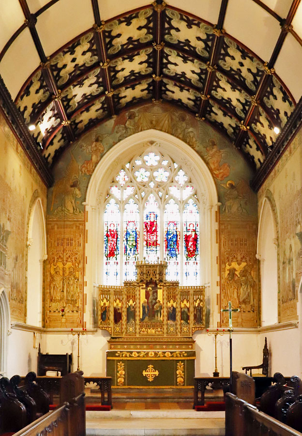 In addition, the chancel windows were provided with borders or variously coloured vine leaves. Much of the non-figurative work appears to have been applied using a stenciling technique.