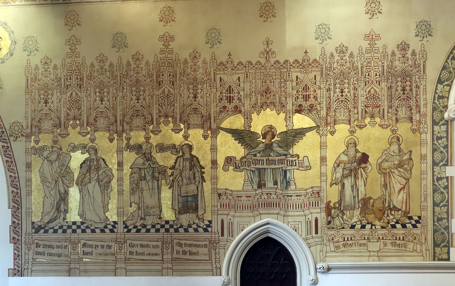 Although following the same general painting scheme as that on the south side, the north wall of the chancel takes advantage of the wider spacing of the windows, and is therefore more expansive. To the eastern end are the figures of the evangelists, Matthew and Mark, reflecting those on the south wall opposite. Likewise an angel above the vestry door holds a scroll with the inscription from the first line of Psalm 51:15; "Oh Lord open thou our lips". In the third panel are the standing figures of St Asaph and Hannah, the latter also on one of the reredos panels, and in the fourth, those of Moses and Miriam. Beneath the western panels inscriptions on scrolls read: