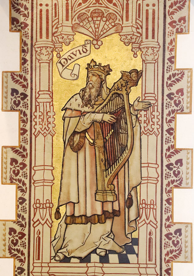 In late 1898 or early 1899 Percy Bacon and Brothers would return to carry out the decoration of the north and south walls of the chancel.3 On the south wall, within stylised niches, and with gilded backgrounds are figures of the evangelists, Luke and John on the left, and on the right, Simeon and the Blessed Virgin Mary. Centred above the priest's door is an angel with a scroll on which is inscribed, "And our mouth shall shout out thy praise", the second line of Psalm 51:15, the first line being on the north wall. West of window SC2 a representation of King David.