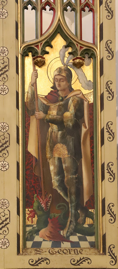 The reredos and retable, designed by Sir Arthur Blomfield, were installed in memory of Mr G. W. Harris by his family. Mr Harris had for many years been a churchwarden at St Andrew's. It was carved from oak by Mr. Runnacles, a builder in Halstead, and formed a heptyche with painted panels by Percy Bacon and Brothers.1 The largest panel at the centre is a crucifixion scene with the Blessed Virgin Mary and St John the Evangelist in their usual positions flanking the cross. To the left, three panels depict St Alban, St Osyth and St Andrew, and to the right, St Peter, Hannah and St George. Below the centre panels, three smaller ones contain demi-angels flanking the Lamb of God. The central panel is essentially taken directly from one of the many drawings of the crucifixion by Martin Schongauer. It seems a similar scheme was executed at St Andrew's, Sharrow, South Yorkshire in 1895 (now lost).