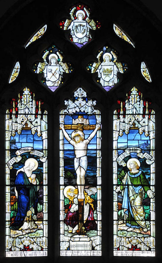 There is a single Percy Bacon & Brothers window in St Mary's, the east. Of three lights with tracery, it depicts in a conventional manner; in the centre; the Supreme Sacrifice of Jesus on the cross flanked by the Blessed Virgin Mary and St John the Evangelist in their customary positions, and kneeling at the foot of the cross, St Mary Magdalene. In the tracery demi-angels hold shields with arma christi. Above the BVM a scroll reads; "Ecce Filius tuus" (Behold thy Son) and above John; "Ecce Mater tua" (Behold thy mother), the words uttered by Jesus in John 19:26-27. The same cartoon for the BVM is used by Bacon at St John's, Rushford, Norfolk, except in that case the scroll above her reads, "Ecce Mater Tua". Below Mary Magdalene are the words from John 19:30, "Consunimatum est" (it is finished).