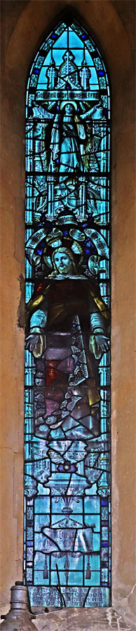 This is very definitely not one of the Bacon Studio's finest, but then dealing with a very narrow, tall lancet would not have been without its difficulties. Given such slender geometry, the design by necessity must be vertical, and lend itself to a single standing figure, or multiple ones arranged one above the other, rather than small narrative scenes. Being a single, isolated lancet compounds the difficulty, as no neighbouring lights can be utilised to spread a narrative scene across the whole, as can be seen in the three east lancets, which although equally narrow, lend themselves to a wider crucifixion scene. One wonders if Derick had any conception that the windows might be filled with stained glass at a later date.