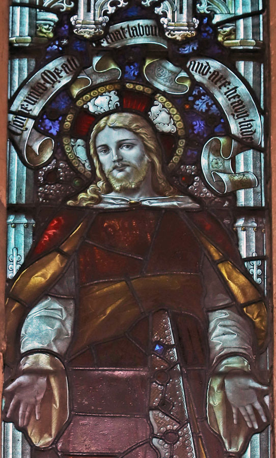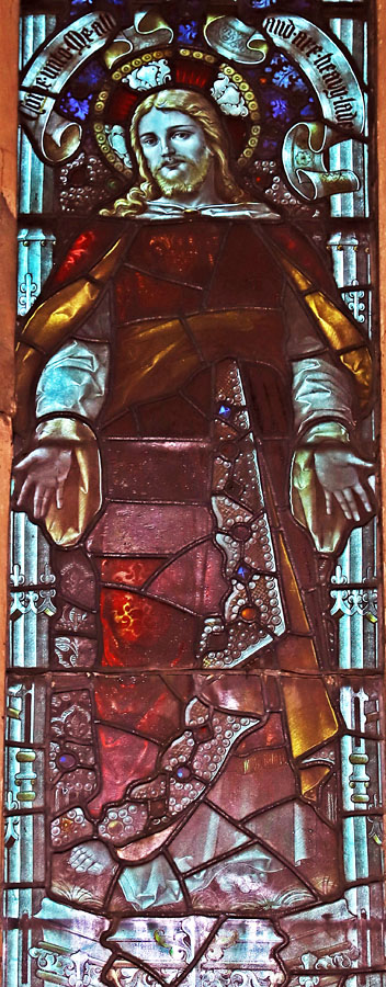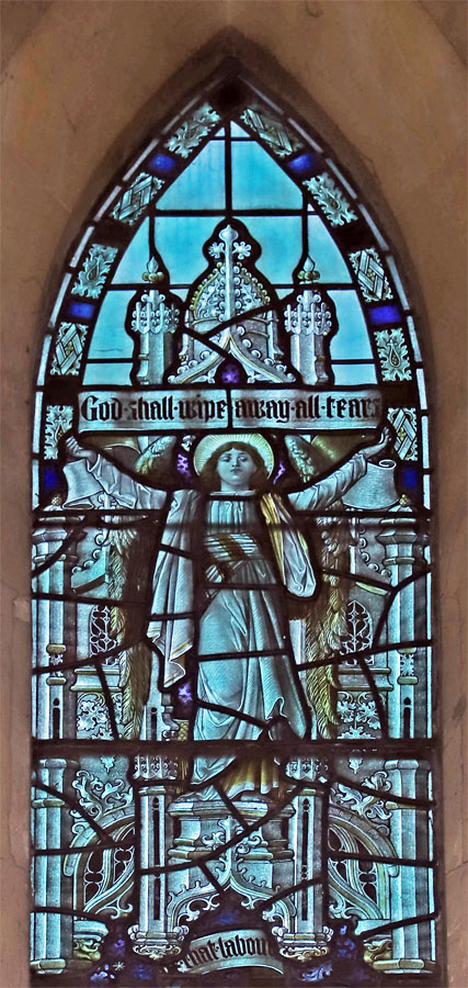 In the case of the north chancel lancet, the single figure of Christ the Consoler is represented. Above him a scroll with the words from Matthew 11:28; "Come unto me, all ye that labour and are heavy laden", [and I will give you rest]. At the top a golden winged angel holds a scroll with the words from Revelation 21:4; "God shall wipe away all tears", [from their eyes].