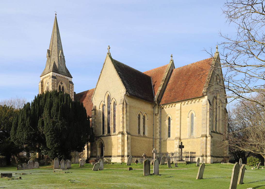 One who likes to visit churches for their architectural beauty will most likely be underwhelmed with St John the Apostle. Described as, "Costly and disappointing"1, the church is rather ill-proportioned and unnecessarily grandiose in its loftiness. Apart from it's elegant broach spire, the rest is plain, unornamented Early English, with tall lancet windows throughout. This simplicity may have pleased some members of the Ecclesiological Society of the day (though the offset tower would not), but one can still not avoid the fact that this building is not particularly pleasing to the eye. The church was built in 1847 to a design by John McDuff Derick (1805-1859) who worked during the early years of the gothic revival and was one of the original proposers of the Architectural Society of Oxford. His work did not always meet with universal approval, and he seems to often have had run-ins with the Ecclesiological Society, whose reviewers of Derick's later works were particularly scathing.2