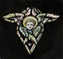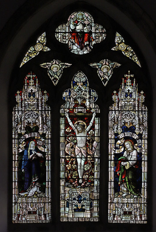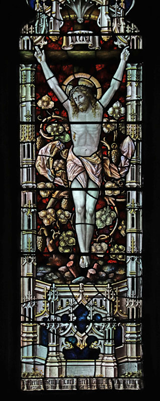 The centre light is a crucifixion scene. Around the cross are wrapped intricate vines laden with fruit symbolic of John Ch 15, "I am the true vine, and my Father the husbandsman", an often used Bacon motif when space did not permit the inclusion of additional figures (cf Wingrave (south chancel). Lucker, and Langley Marish). Above St Mary, "Ecce filius tuus", and above John, "Ecce mater tua" (Behold my son, Behold thy mother). Each figure is dwarfed somewhat by the highly elaborate niches, which Newman describes as being, "overloaded".4