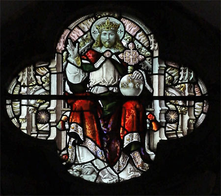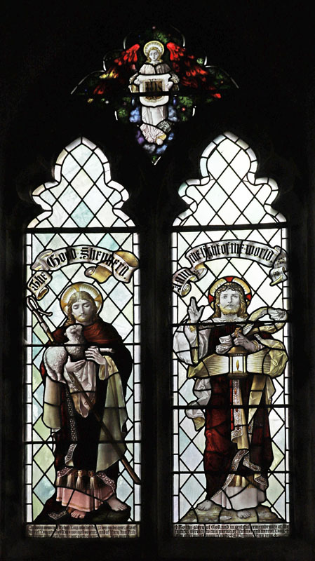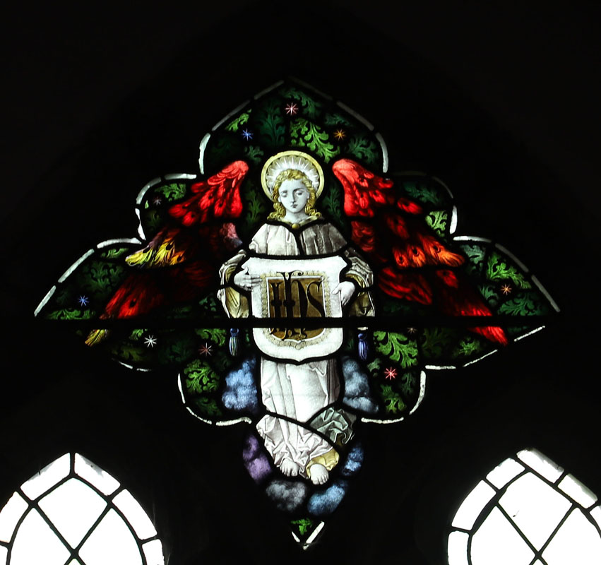 Simple two light window lacking the usual Bacon Studios elaboration. The two standing figures of Christ are set in lightly tinted diamond quarries. In the tracery an angel holds a shield bearing the IHS monogram. The dedications read: