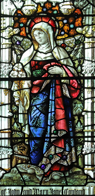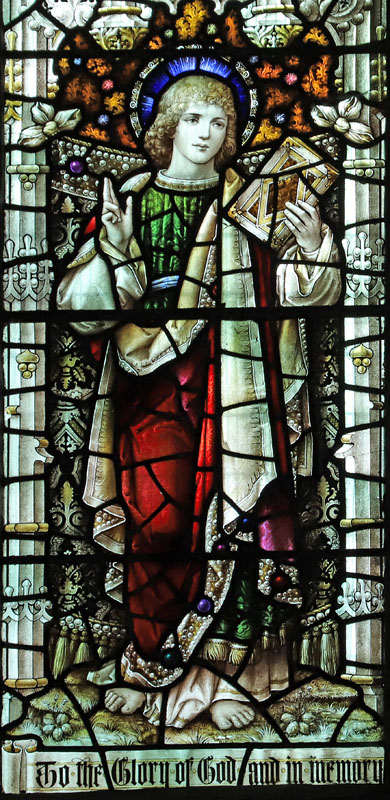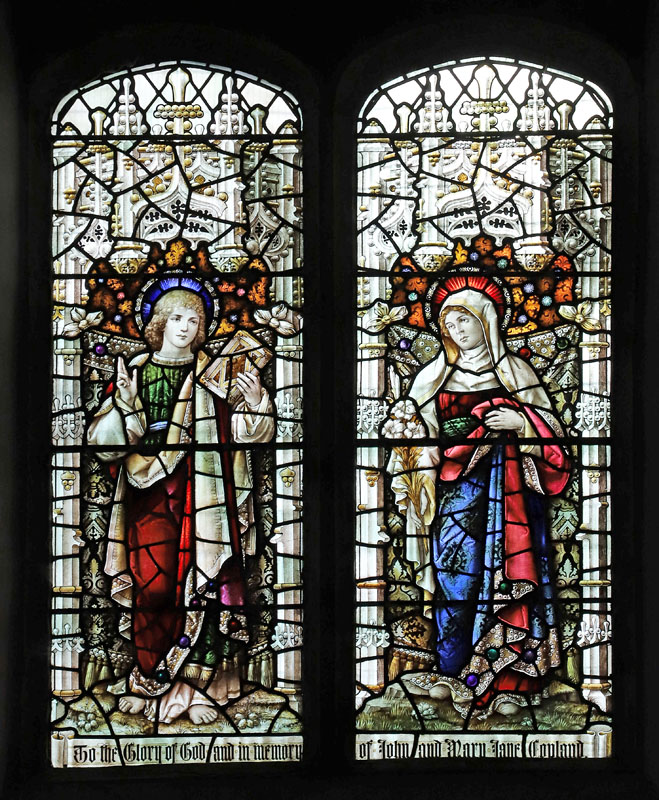 There is a single Bacon Studios window in St Mary's, of two lights depicting the standing figures of St John the Evangelist and the Blessed Virgin Mary. Both characters are painted as adolescents.