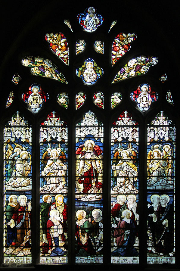The east window is of five lights with tracery. The main lights are divided vertically, the central upper light being the figure of Christ seeming to rise heavenward on a cloud, flanked on either side by attendant angels two of which hold scrolls with words from Acts 1:11, "Shall so come in like manner". In the lower lights the 11 apostles and the Virgin Mary.