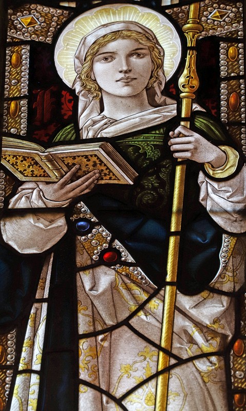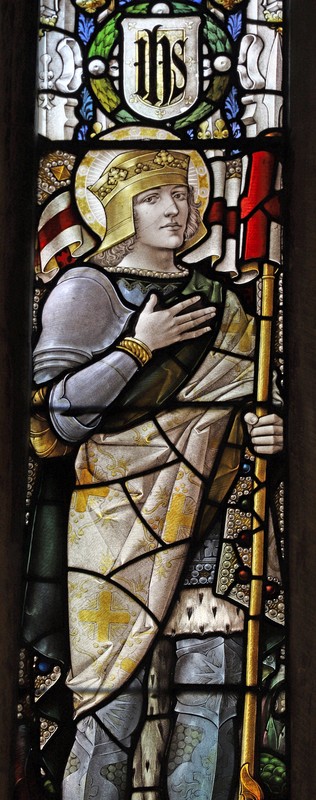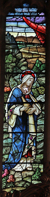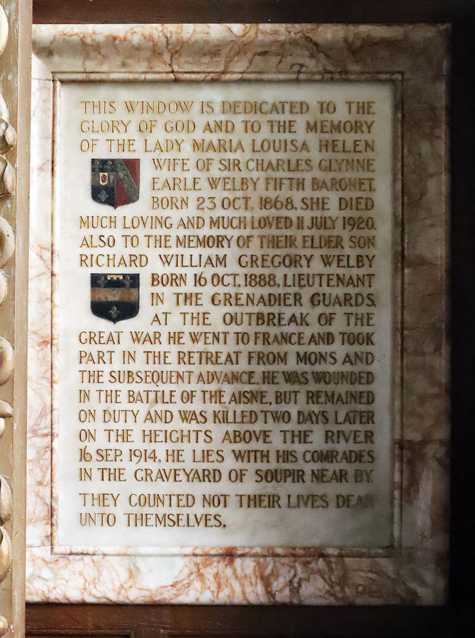 The window is a memorial to Lady Maria Welby who died 1920 and her son Richard a casualty of the First World War. Lt. Welby of the 2nd Grenadier Guards took part in the retreat from Mons, and was killed in action at Cour de Soupir, the battle of Aisne 16 September 1914. He is buried in Soupir churchyard near Yailly on the Aisne. More here. The window was donated by Sir Charles Glynne Earle Welby and was installed circa 1924/5.2