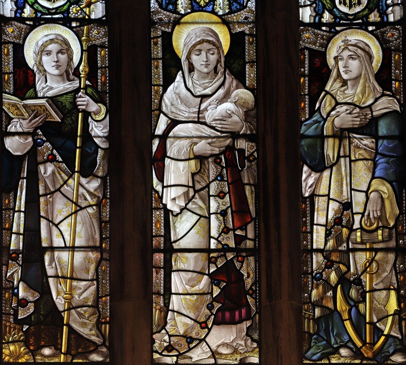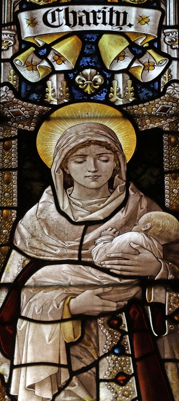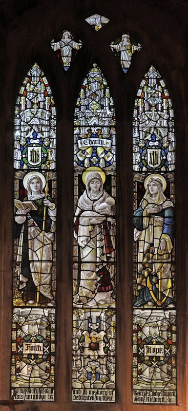 North Aisle 2: Three light window with simple Y-tracery identical to North Aisle 1 forming a unified pair. Figures of Faith, Charity and Hope stand on ornate pedestals with souring elaborate canopies above. There are no flanking columns. IHS monograms above Faith and Hope, and a heart below Charity. Each holds their emblems of crossed staff, a child and an anchor. In the tracery angels with outstretched arms replicating those in the adjacent window. At the very top a white dove,