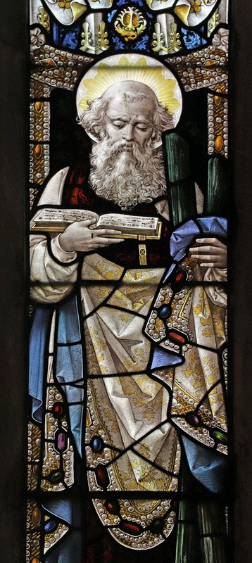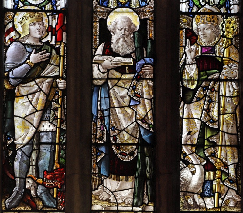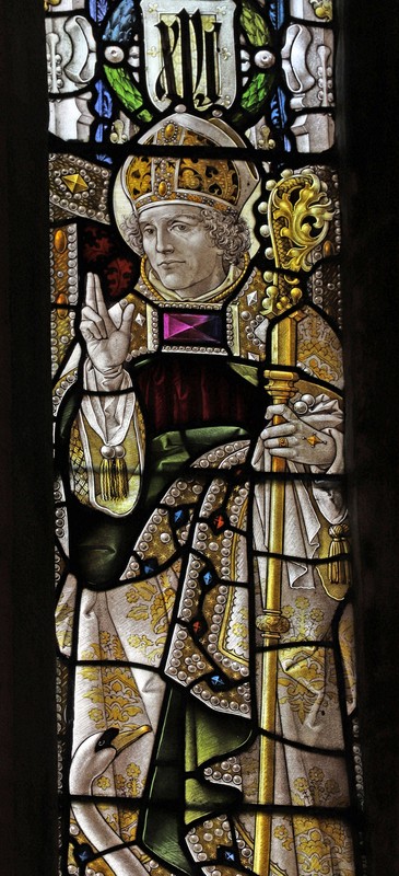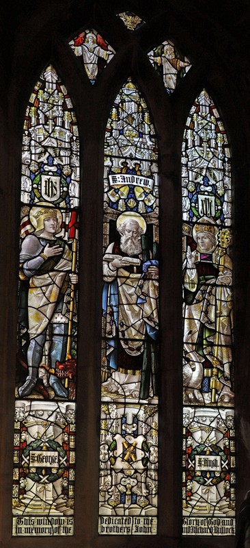 North Aisle 1: Three light window with simple Y-tracery. Figures of St George, St Andrew and St Hugh as Bishop of Lincoln stand on ornate pedestals with souring elaborate canopies above. There are no flanking columns. IHS monograms above George and Hugh. At the foot of George a red fire breathing dragon; St Andrew holds a book, and a simple saltire cross made from tree branches at the base, while Hugh is accompanied by his attribute, a white swan. In the tracery angels with outstretched arms.