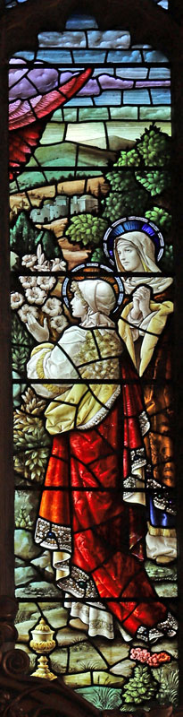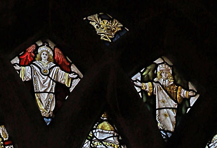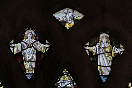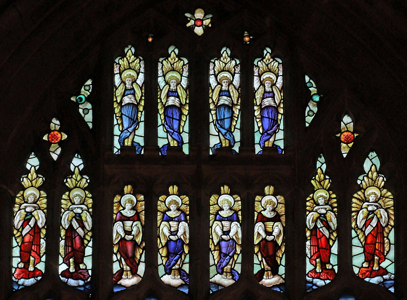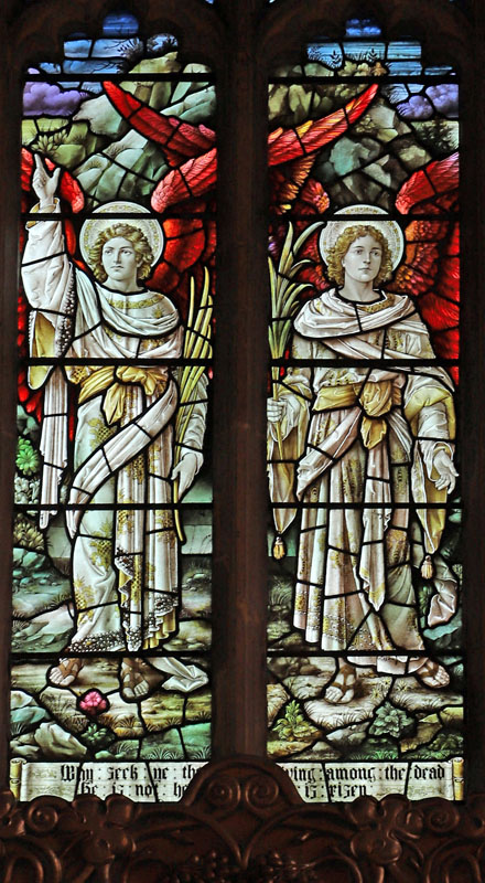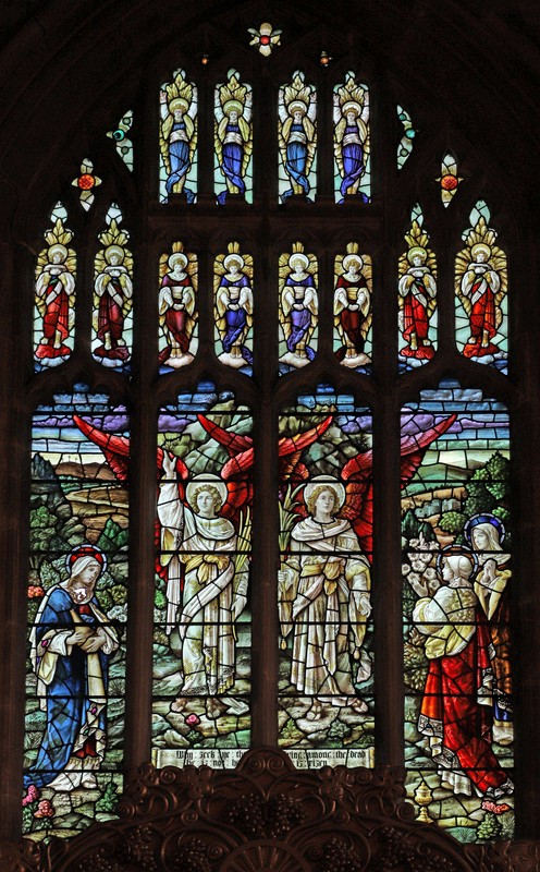 The grand east window, of four lights and tracery depicts the three women at the empty tomb in a unified scene (specifically the story told in the Gospel of Luke 24:1-6, which tells of them meeting two men, "in shining garments")*. Centre are two angels with souring, outstretched red wings. In the tracery stand angels with feathered mandorla, the lower cohort in prayer and the upper (rather strangely) with their arms aloft. The figures are repeated in pairs of identical, mirrored paintings. There are no canopies.