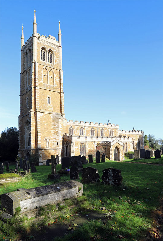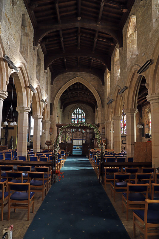 St Andrew's is a large church with a fine, tall square tower of five stages, topped at the corners with slender well proportioned pinnacles. A good deal of the church is 14th century. It was restored by Arthur Blomfield in 1888. There is a long and slender embattled nave with clearstory and north and south aisles (the south extending well beyond the east end of the nave) and a large chancel.