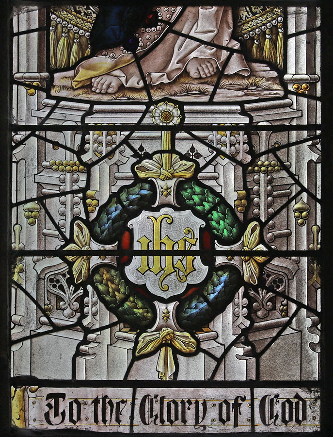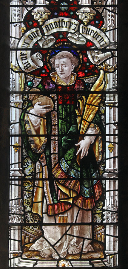 Bacon goes on to describe other elements of the window's design, the tracery lights and other details which were faithfully executed. The main difference between Bacon's description and the finished window is the substitution of another saint in the rightmost light, and an altogether different inscription on the scroll above the figure. This figure is a little ambiguous. He is clearly a tonsured monk (though dressed in rich clerical robes), and he holds in his left hand a martyr's palm, and in his right a bag. What the bag contains is moot. If stones, then this could be a representation of St Stephen, the first Christian martyr. Above the figure the scroll reads: "Bear us one another's Burden" (Galatians 6:2). Unfortunately the correspondence in the Lincolnshire Archives does not shed any light on this change, who instigated it, or when. All the figures stand within Bacon's trademark architectonic niches which are overly fussy and flamboyant in this window. In his letter to the Rev. Goodacre, Percy Bacon rather cryptically says that the design was a copy of No. 4081, though no similar design has yet come to light.