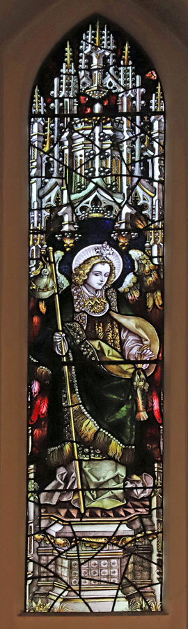 All the stained glass windows except the plain ones in the clearstory are from the Percy Bacon Studio. Although it is not clear whether Charles Innes had any influence in the designs or subject matter in the windows, if it was Percy Bacon's desire to work in harmony with architects (see transcript of his lecture given to the Northern Architectural Association on 17th January 1894), thereby bringing harmony to church decoration, then St Michael's may be one of the best examples of his attempts to do so. He seems largely to have achieved that harmony at St Michael's..